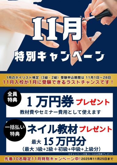1月のネイリスト検定(3級・2級)の受験申込期間は 11/1〜11/28必着。