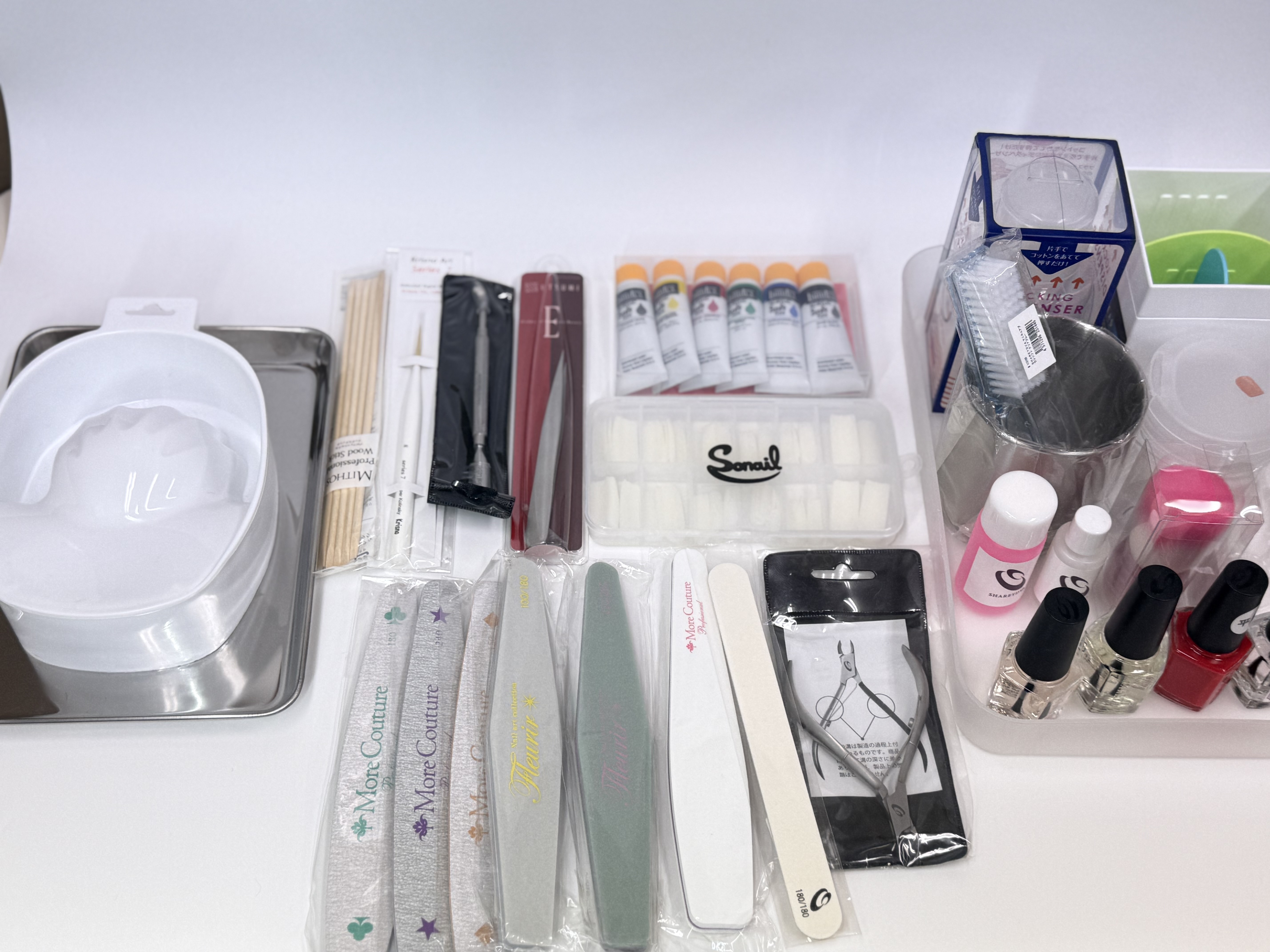 | 検定3級(ネイルケア基本) | 自爪ファイル、ネイルファイル(3種)、スポンジファイル(3種)、ネイルシャイナー、爪用スティック、ファイル立て、消毒用ステリライザー、ピンセット、爪用シザー、ガーゼ、テーブルペーパー、コットン、キューティクルニッパー、キューティクルプッシャー、爪用ニッパー、ベースコート、トップコート、ネイルカラー、エタノール消毒、アクリル絵の具各種、ジェル筆、ペーパーパレット、トレイ(大・小)、検定用ラベル、練習用ハンド、練習用チップ、爪用グルー、フィンガーボウル、チップカッター、コットンケース、ポリッシュリムーバー、ポリッシュリムーバー入れ、ネイルブラシ、爪用消毒剤、液体ソープ | 自爪の整え・甘皮処理・基本塗布・衛生管理の習得に必要な全て。ファイルの粗さ使い分けや衛生器具の正しい運用を繰り返し実践します。 |